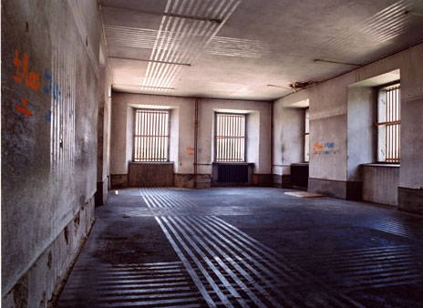 Panama Der leere Fabriksaal hat auf allen vier Seiten Fensteröffnungen, die mit einem Lattenrost abgesperrt sind. Das Streifenmuster, das sich daraus ergibt, führen wir weiter, indem wir mit Klarlack die Verlängerung jeder Latte über Sims, Wand, Boden, gegenüberliegende Wand und Decke malen. Die Kreuzungen, die sich so ergeben, wirken wie ein Geflecht. Je nach Lichteinfall und Standpunkt der BetracherIn leuchten andere Streifen auf. |