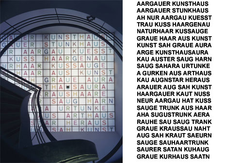 Stunkhaus Aus den Buchstaben des Begriffes “Aargauer Kunsthaus“ bilden wir Anagramme, welche wir einem Kreuzworträtsel ähnlich in die Felder der quadratisch unterteilten Oberlichtdecke einfüllen. In der Breite ist jeweils ein Anagramm lesbar. So reiht sich Anagramm an Anagramm bis der Text mit sechzig “Zeilen“ die ganze Decke ausfüllt. Jeder Buchstaben erhält eine andere Farbe (A=rot, R=Grün etc); auf der Einladungskarte ersetzen wir die Buchstaben ganz durch die entsprechenden Farben: ein Farbmuster entsteht, welches wieder als eine Auswahl der Anagramme entcodiert werden kann. |