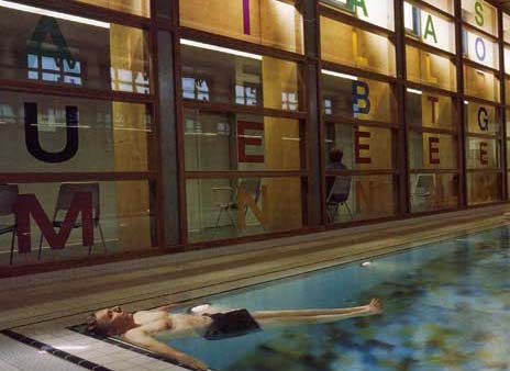 Rheuma- und Rehabilitationsklinik Schinznachbad In die beiden verglasten Längsseiten des Bades setzen wir farbige Buchstaben und schreiben damit Wörter aus dem Sinnzusammenhang des Bades und der Heilung. Die Farbigkeit der Buchstaben wiederholt sich in der Tiefe des Beckens, so dass der Betrachter/ die Benutzerin des Bades immer zwischen abstrakten Mustern und konkreten Begriffen, die seine/ihre Vorstellungen anregen, oszillieren kann. . |