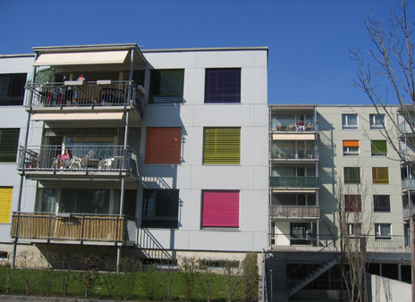 Wohnsiedlung Seebach Für die Lamellenstoren wählen wir 10 Farben, welche den ganzen Farbkreis umschliessen. Die Farben werden zufällig auf die einzelnen Fenster verteilt. Aus den reinen, klaren Formen der Storen und ihren Farben und dem Zusammenspiel von Zufall, Gewohnheit der BewohnerInnen, Wetter und Tageszeit entstehen so immer neue Fassadenbilder. Die Storenfarben bilden sich als lichte Farbreflexe im Wohnungsinnern ab. |