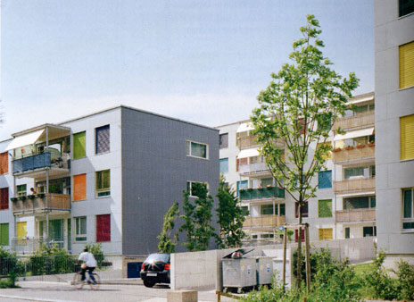 Wohnsiedlung Seebach Für die Lamellenstoren wählen wir 10 Farben, welche den ganzen Farbkreis umschliessen. Die Farben werden zufällig auf die einzelnen Fenster verteilt. Aus den reinen, klaren Formen der Storen und ihren Farben und dem Zusammenspiel von Zufall, Gewohnheit der BewohnerInnen, Wetter und Tageszeit entstehen so immer neue Fassadenbilder. Die Storenfarben bilden sich als lichte Farbreflexe im Wohnungsinnern ab. |