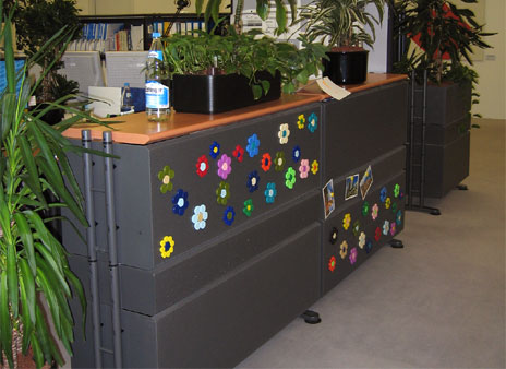 Diese Magnete können von den Angestellten zur „Organisation“ ihres persönlichen Arbeitsplatzes benutzt werden (Festpinnen von Notizen, Zeitungsartikeln oder Familienfotos), sie können aber auch frei zu neuen, eigenen Farbklängen und Muster zusammengestellt werden. |