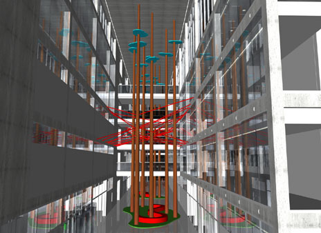 Wir installieren drei künstliche „Bauminseln“ in die Lichthofhalle, welche auch als Aufenthaltsbereiche genutzt werden können. Diese sollen keine Naturlandschaft imitieren, sondern sind in ihrer formalen Umsetzung sowie von den verwendeten Materialien her stark reduziert und abstrahiert.