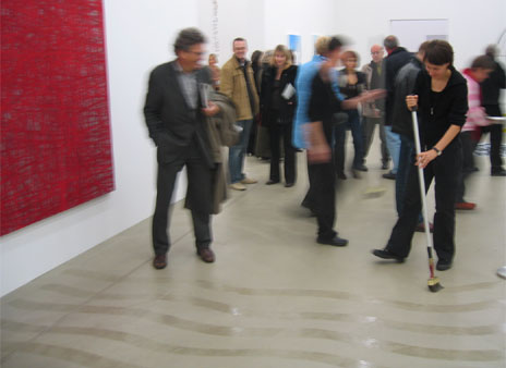Mit Wasser und Pinsel malen wir ein Muster aus Wellenlinien auf den saugfähigen Fliessbetonboden der Parterreräume. Noch während der Performance verschwinden erste Teile des Bodenbildes wieder.